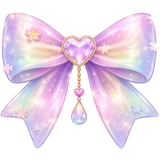 Um laço colorido e brilhante com tons de rosa e roxo, com um coração dourado no centro e um pingente em forma de gota.