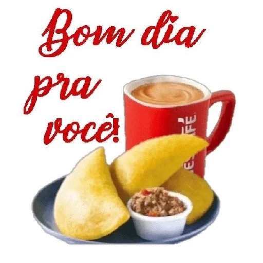 Um copo de café com leite ao lado de uma cesta de pão de queijo, com os textos 'Bom dia' e 'Tá servido'.
