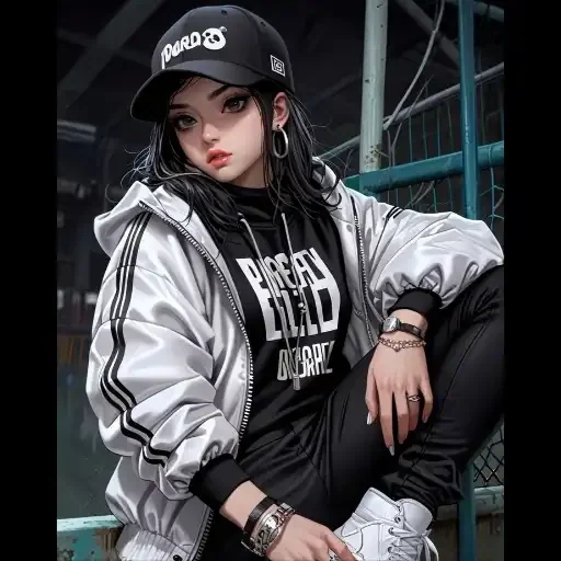 Uma jovem mulher sentada usando um boné preto, jaqueta branca e moletom preto com texto 'BEST BAD GIRL', com pulseiras e maquiagem.