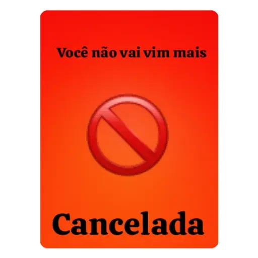 Um cartão vermelho com um símbolo de proibição e o texto 'Você não vai vim mais' na parte superior e 'Cancelada' na parte inferior.