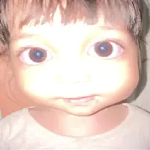Rosto de uma criança com olhos arregalados e iluminados, parecendo surpreso ou assustado, vestindo uma camisa branca.