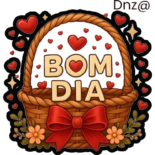 Cesta de vime com laço vermelho e flores, contendo a mensagem 'BOM DIA' em letras grandes, rodeada de corações vermelhos e estrelas.