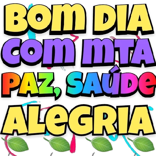 Um desenho colorido com a frase 'Bom dia com mta paz, saúde alegria' em letras grandes e coloridas. Fundo branco com folhas verdes e linhas coloridas.
