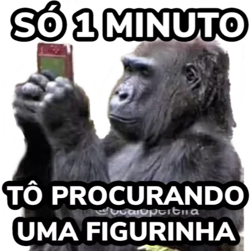 Um gorila cinza olhando para um objeto verde e vermelho na mão esquerda, com texto preto e branco ao fundo: "SÓ 1 MINUTO TÔ PROCURANDO UMA FIGURINHA".