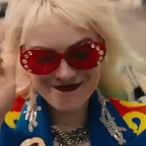Mulher loira com óculos de sol vermelhos decorados com strass, fazendo um gesto com a mão.