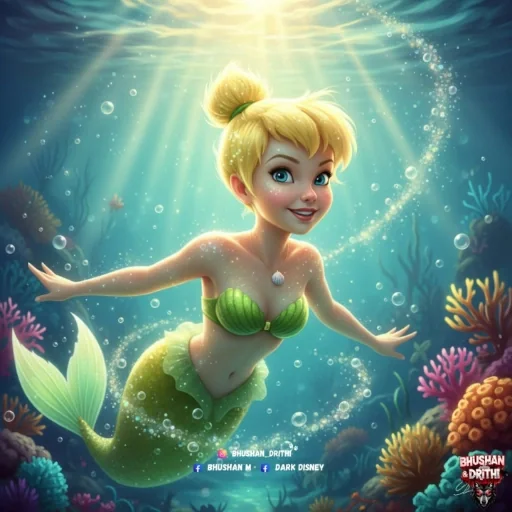 Uma princesa sereia loira com cauda verde nadando debaixo d'água, cercada por coral e peixes, com raios de sol penetrando a superfície.