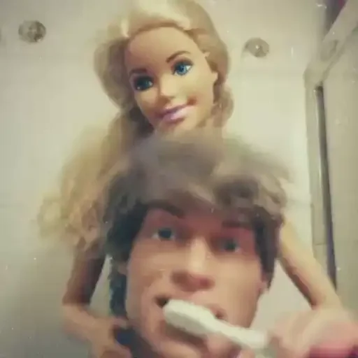 Uma boneca Barbie com cabelo loiro está por trás de um homem com escova de dentes na boca, ambos com expressões engraçadas.
