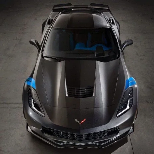 Um carro esportivo Corvette preto visto de cima, com detalhes em azul e um logotipo laranja no capô.