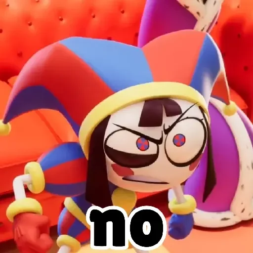 Uma personagem de desenho animado vestida como um bobo da corte, com chapéu colorido e expressão zangada, com o texto 'no' em destaque.
