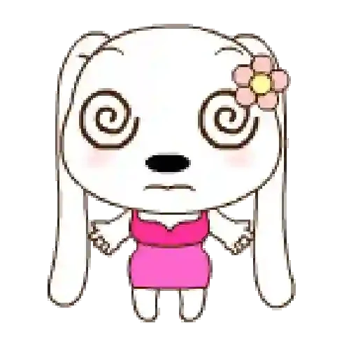 Um desenho de um cachorro com expressão triste, vestido com um vestido rosa e um enfeite de flores no cabelo.