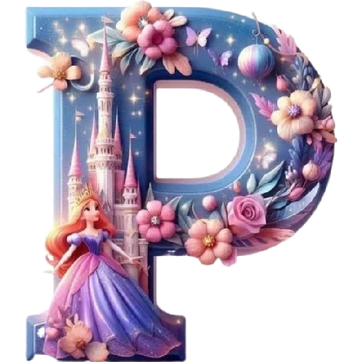 Letra 'P' decorada com a princesa Aurora e um castelo ao fundo, rodeada de flores e borboletas em tons de rosa e roxo.