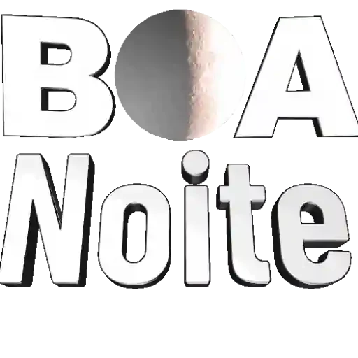 Uma figurinha com o texto 'BOA Noite' em letras grandes e brancas, com um círculo cinza e rosa ao lado da letra 'O'.