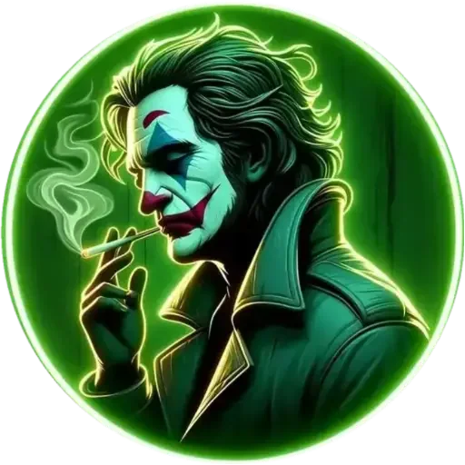 O Coringa fumando um cigarro com um fundo verde neon. Ele tem uma expressão sorridente e cabelos desalinhados.