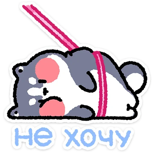 Um desenho de um animal, provavelmente um rato ou esquilo, deitado de lado com uma expressão triste ou desapontada. O animal é cinza com manchas rosadas no rosto e tem um objeto rosa diagonal atravessando seu corpo. Abaixo do animal, há um texto em russo 'He XOY'.