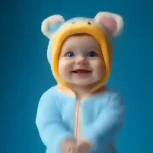 Um bebê com um macacão azul e uma touca amarela com orelhas de ursinho, com uma expressão facial fofa.