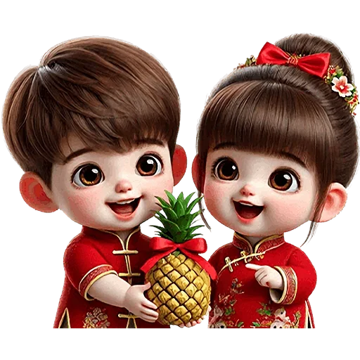 Dois personagens de anime, um menino e uma menina, vestidos com trajes vermelhos tradicionais chineses, segurando um abacaxi decorado com um laço vermelho.