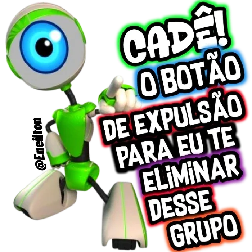 Um robô verde com um olho grande e azul, com texto 'CADE! O BOTÃO DE EXPULSÃO PARA EU TE ELIMINAR DESSE GRUPO'.