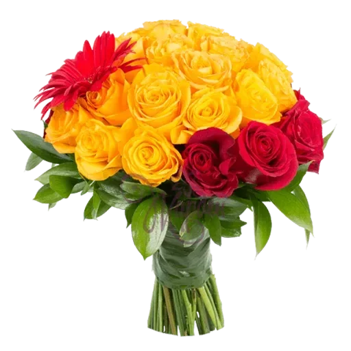 Um buquê de rosas amarelas e vermelhas com folhas verdes.