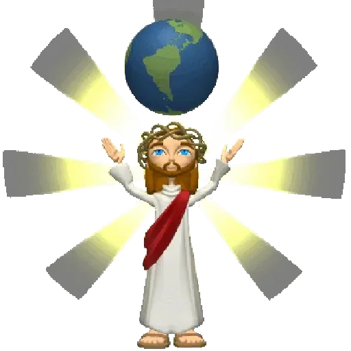 Jesus Cristo com as mãos levantadas e uma auréola, equilibrando o globo terrestre acima de sua cabeça, com raios de luz saindo de suas mãos.