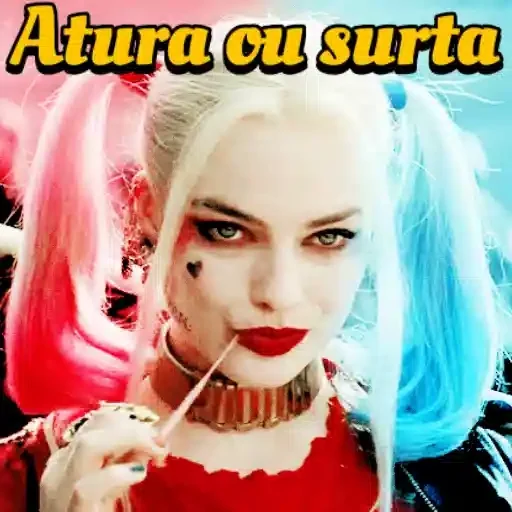 Harley Quinn com expressão séria, penteando seu cabelo com um pente, usando um vestido vermelho e com a frase 'Atura ou surta' em destaque.
