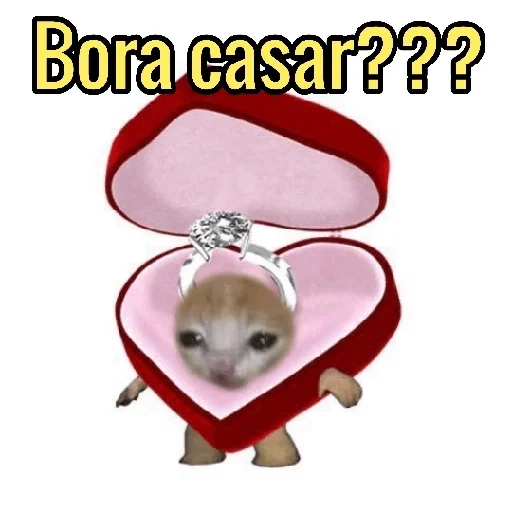 Um hamster com expressão séria saindo de uma caixa de joia em forma de coração vermelho, com a frase 'Bora casar???'
