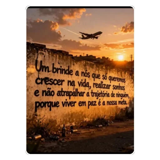 Um avião voa sobre uma paisagem ao pôr do sol com uma citação em preto: 'Um brinde a não querer crescer na vida, realizar poucas e não atropelhar a trajetória de ninguém, porque viver em paz é a nova riqueza.'
