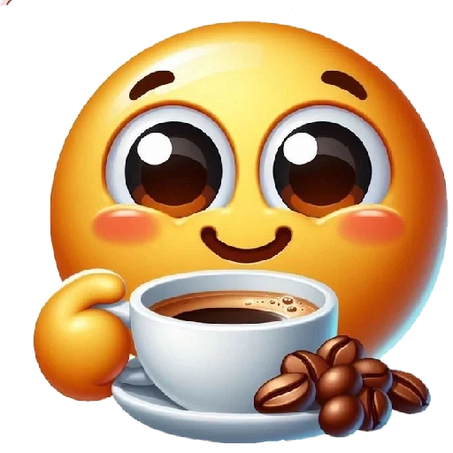 Um emoji amarelo com expressão feliz e olhos grandes, segurando uma xícara de café com café, com alguns grãos de café ao lado.
