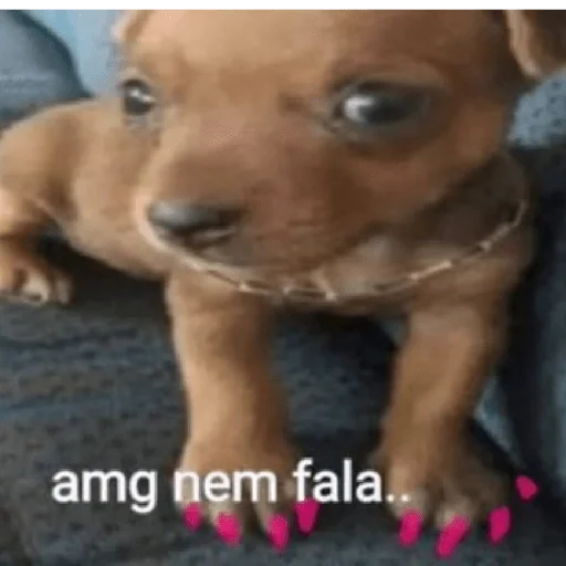 Um filhote de cachorro marrom com uma expressão fofa e um colar, com o texto 'amg nem fala...' em branco na parte inferior.