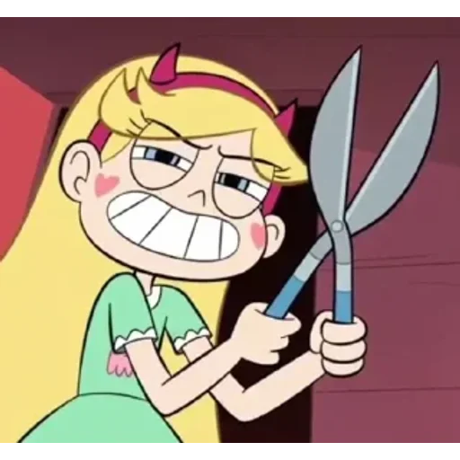 Uma menina de cabelo loiro e chifres vermelhos, vestindo uma camisa verde, segura tesoura com uma expressão zangada e dentes arreganhados.
