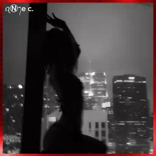 Silueta de uma mulher de costas contra uma janela com uma cidade noturna ao fundo. A imagem é em preto e branco com uma borda vermelha.