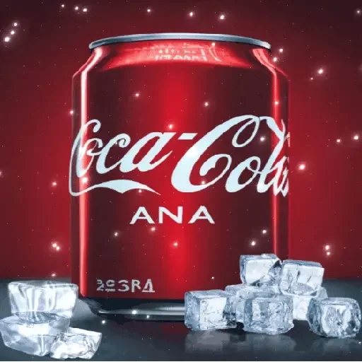 Lata de Coca-Cola com cubos de gelo em frente, fundo vermelho com faíscas. A lata tem o texto 'Coca-Cola' em branco e 'ANA' embaixo.