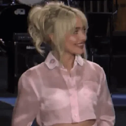 Mulher loira com cabelo em um coque alto, vestindo uma blusa rosa translúcida, olhando para o lado com uma expressão neutra.