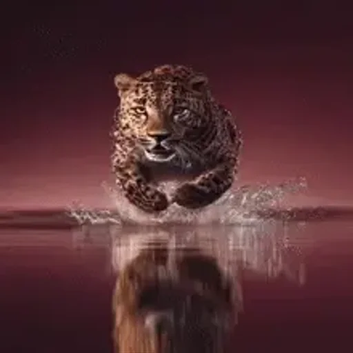 Um tigre pulando na água, com reflexo na superfície, fundo escuro e avermelhado.