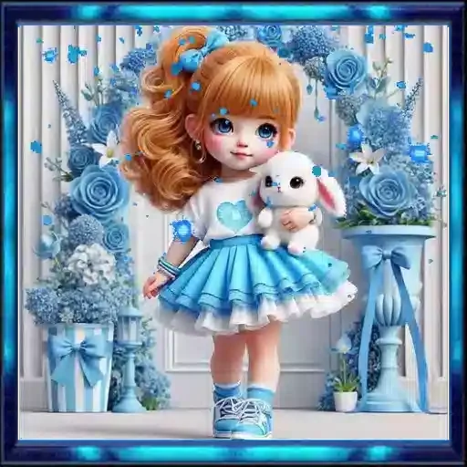 Menina de cabelo ruivo com uma rabinha azul e um coelho branco, vestida com um vestido azul e branco, em um cenário com flores azuis.