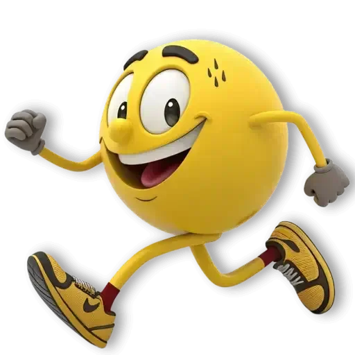 Um personagem amarelo de olhos grandes e sorriso largo, com sobrancelhas e luvas, correndo com um pé à frente.