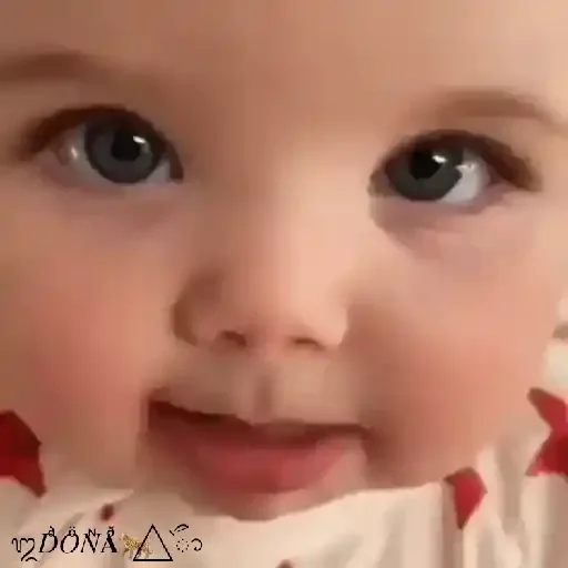 Rosto de bebê com olhos arregalados e boca aberta, vestindo uma roupa branca com estrelas vermelhas. Fundo não visível.