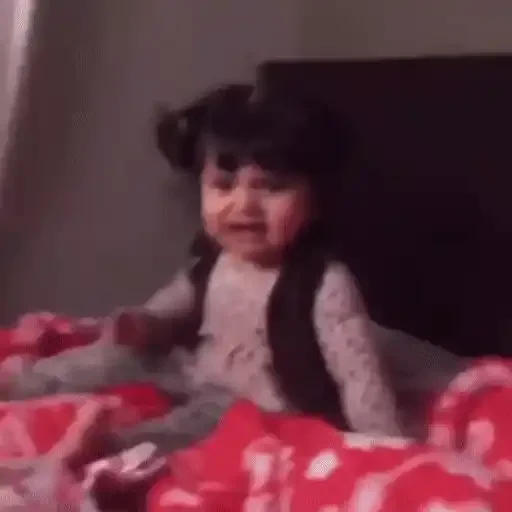 Menina com cabelo castanho e camisa rosa, fazendo careta com os olhos fechados e boca aberta, mostrando os dentes.