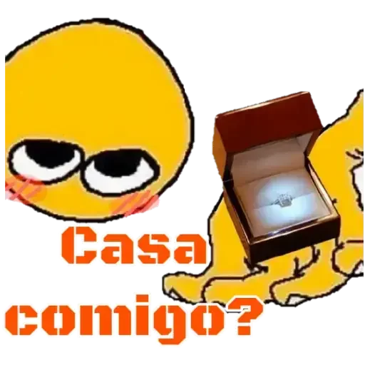 Um emoji amarelo com olhos sonhadores e bochechas rosadas olha para uma caixa de joias com um anel brilhante, enquanto pergunta 'Casa comigo?' em texto laranja.