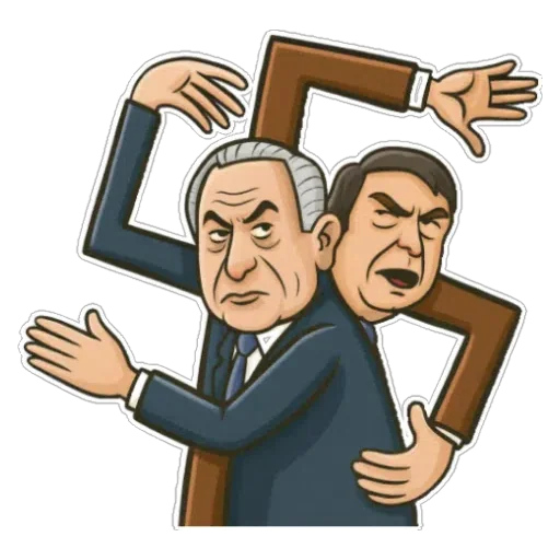 Dois homens de terno com expressões sérias, um atrás do outro com os braços ao redor, como se estivessem dançando ou abraçando.