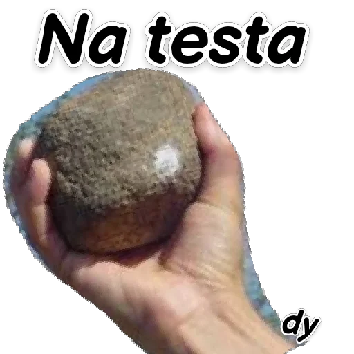 Uma mão segurando uma pedra grande e cinzenta com a frase 'Na testa' escrita em preto com contorno branco acima.