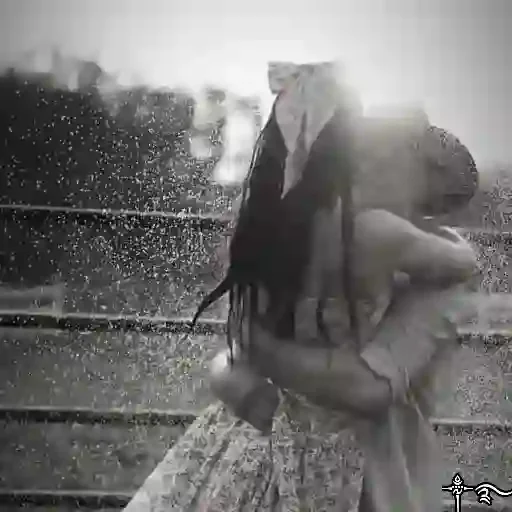 Um casal se abraçando em preto e branco, com chuva ao fundo e um efeito de luz solar intensa.