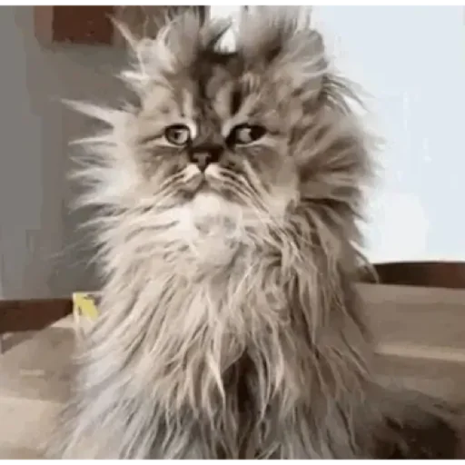 Gato cinza com olhos grandes e arregalados, parecendo surpreso ou assustado. O gato tem bigodes longos e uma expressão…