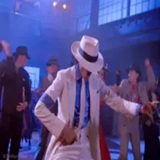 Homem dançando em um ambiente com iluminação azul, usando um terno branco e um chapéu branco com faixa preta. Outros homens ao fundo também dançam.