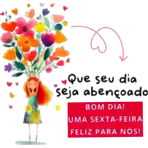 Uma menina com cabelos vermelhos e vestido colorido segura um grande buquê de flores coloridas. Há um texto que diz 'Que seu dia seja abençoado' e 'Bom dia! Uma sexta-feira feliz para nós!'