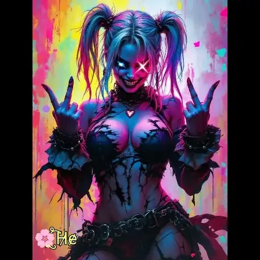 Uma imagem colorida de Harley Quinn com penteados em pigtails, maquiagem pesada e uma expressão ameaçadora. Ela está…
