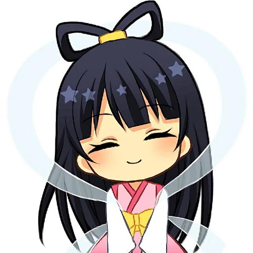 Garota de anime com cabelo preto e olhos fechados, usando um yukata rosa e branco, com estrelas no cabelo.