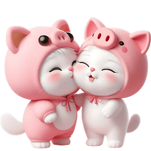 Dois gatos fofos vestidos com roupas de porco rosa, se beijando. Eles têm olhos fechados e bochechas rosadas.