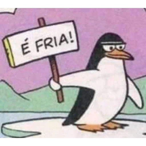 Um pinguim de desenho animado com óculos de sol segura uma placa que diz 'É FRIA!'. O fundo é roxo com montanhas verdes.