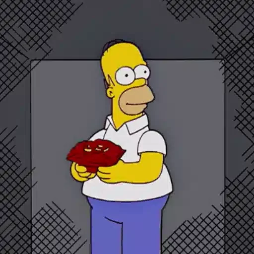 Homer Simpson com expressão confusa ou hesitante, vestindo uma camisa branca, com as mãos levantadas e dedos indicador…