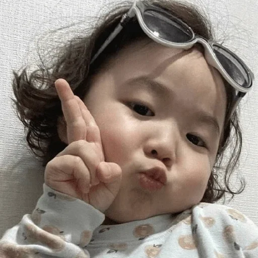 Bebê com óculos de sol na cabeça fazendo um gesto com a mão.